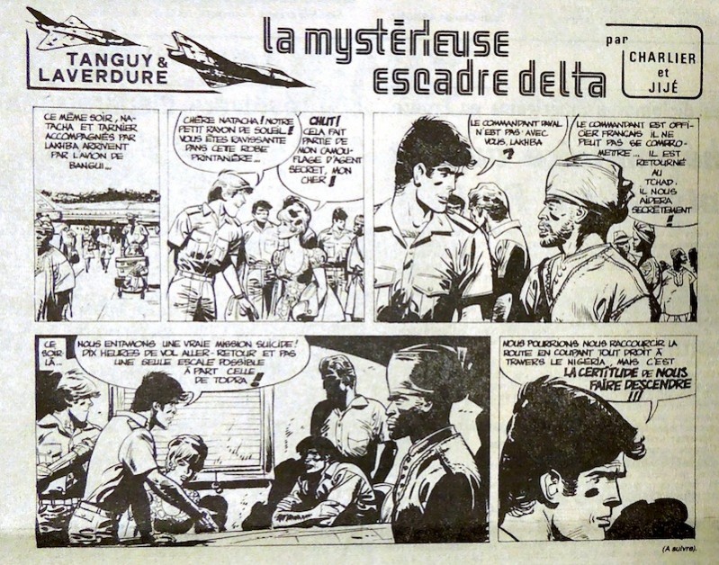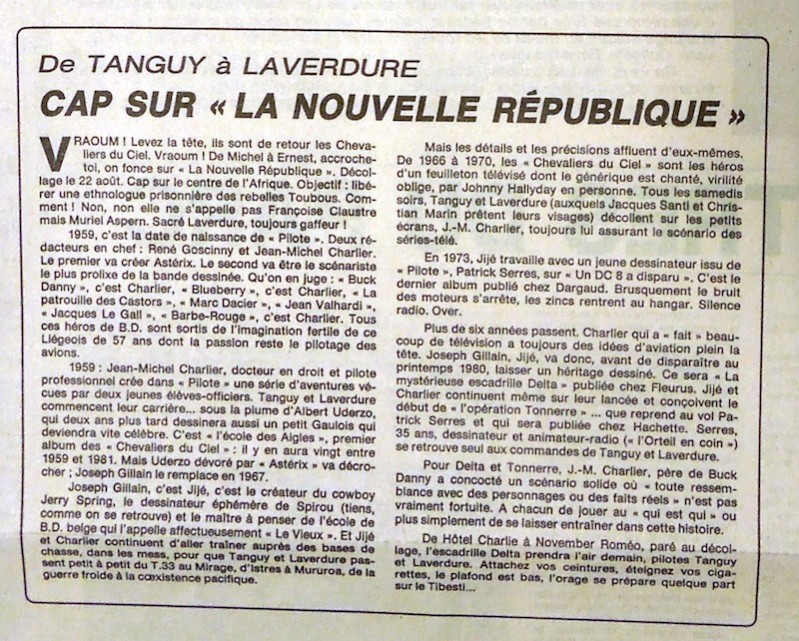 Il fallait bien y venir. La Nouvelle République a donc publié du 22 août 1981 au 21 mars 1982 deux histoires complètes des Chevaliers du Ciel : d’abord La mystérieuse escadre Delta, puis dans la foulée Opération Tonnerre. Les deux tomes sont en effet complémentaires racontant avec des patronymes à peine modifiés la captivité d’une ethnologue française, Françoise Claustre (appellée ici Muriel Aspern) détenue par les rebelles Toubous d’Hissène Habré (Hassan Koubré) dans les contreforts du Tibesti.