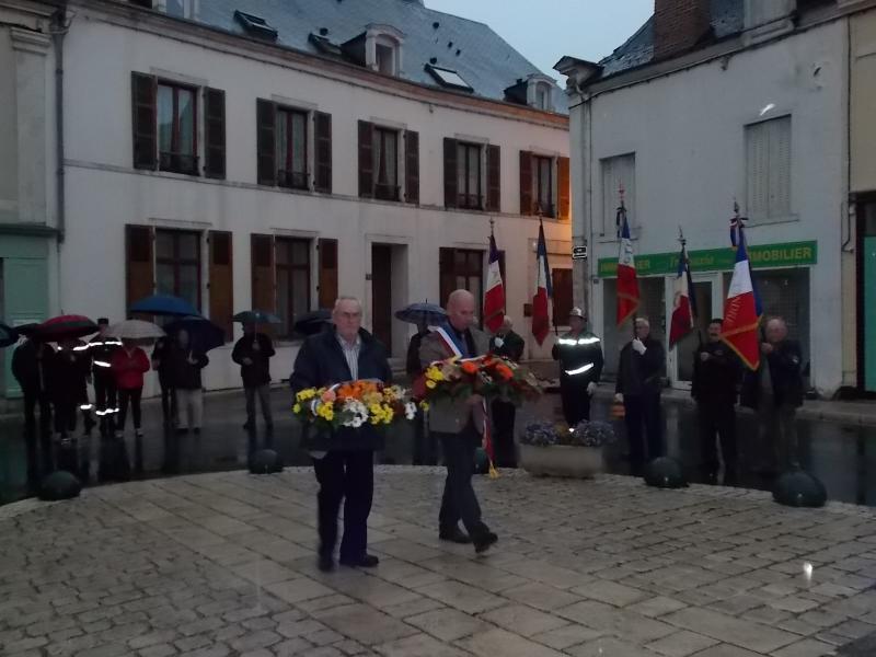 Sous la pluie, et après le discours de Jean-Paul Rabier, président du comité d’entente des anciens combattants de Saint-  Gaultier, à l’origine de cette cérémonie, deux gerbes ont été déposées au pied du monument aux morts, une offerte par la municipalité et l’autre par le comité.