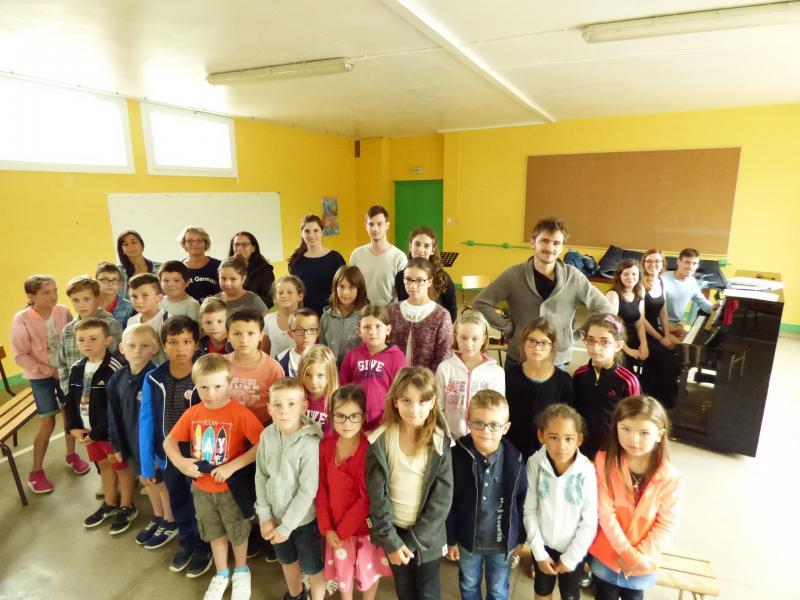 Les enfants, l’encadrement et les élève musiciens de Boulognes-Billancourt, qui ont fait suivre les instruments dont un piano.