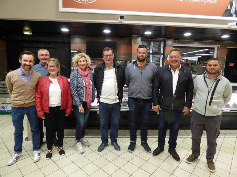 Au centre : Didier Thiriat et Florent  Sivigny, entourés par M. et Mme Portal et les collègues du rayon boucherie d’Intermarché