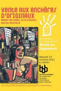 Pour la dixième année consécutive, l’association Droit au logement (DAL) organise une vente aux enchères d’originaux de bandes dessinées, illustrations et dessins de presse qui se tiendra samedi 15 octobre à 14 h 30 aux Trois baudets, 64 boulevard de Clichy, 75018 Paris (Métro : Blanche).