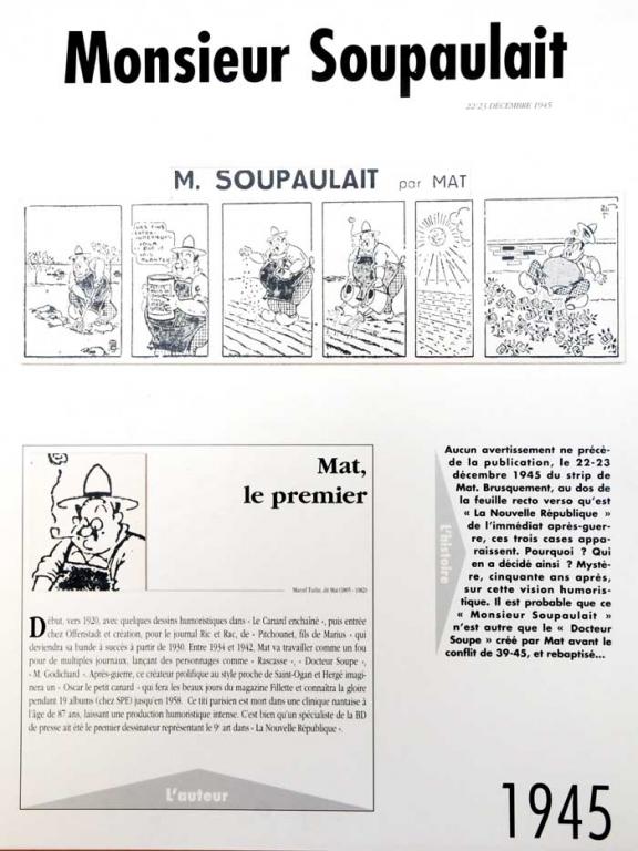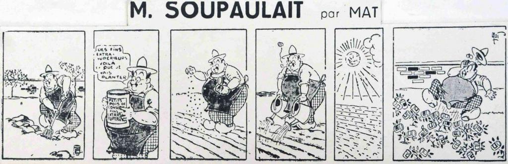 Dans le numero du week-end du 22-23 décembre 1945, à la veille de Noël, en effet, un strip en quelques cases fait son entrée en pied de verso. Il s’agit de « Monsieur Soupaulait », un gros bonhomme moustachu dont personne ne se souvient ni pourquoi, ni comment il a pu venir planter ses choux dans les colonnes de la NR naissante, toujours composée d’une simple page. Le strip en question est signé de Mat.