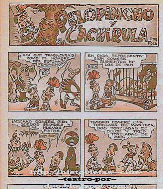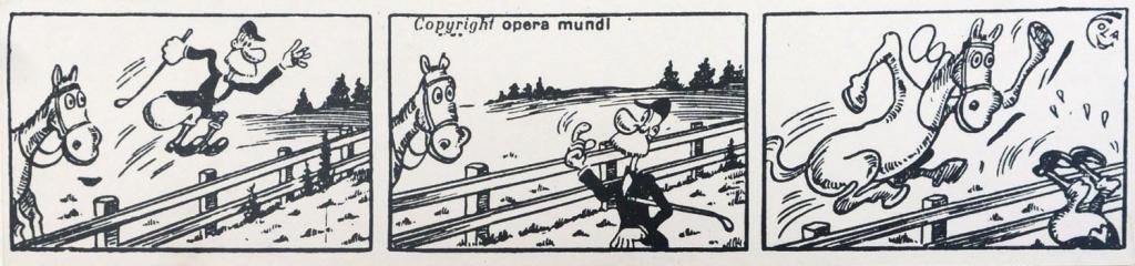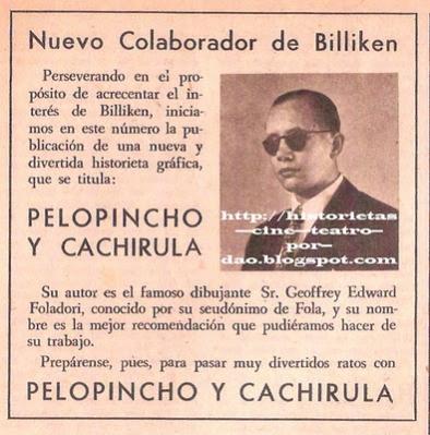 Geoffrey-Edward Foladori, dit Fola (1908- ???). Regardez bien la signature tarabiscotée en coin droit de la case. Ce personnage rieur. La première lettre ressemble à un C, mais c’est bien un F majuscule. Et on lit bien… Fola. Drôle de bonhomme ce Fola : né dans le fog de Londres au début du siècle mais très vite – à l’âge de 11 ans – transbahuté dans la pampas d’ Uruguay où il va faire l’essentiel de sa carrière à Montevideo. Pendant 32 ans, il va travailler pour le Mundo Uruguaho puis (ou parallèlement ?) pour une revue mythique en Amérique du Sud, Billiken, pendant 18 ans. Ce journal, véritable institution, première revue pour enfants en langue espagnole, est née  en Uruguay en novembre 1919. Elle a vécu jusqu’au n° 4.700 du 12 mars 2010. Les héros locaux de Fola  (Don Tranquilo y Flia , Ciengramos y Viola, puis Palopincho y Cachirula ) sont certes restés confinés au public d’Argentine et d’Uruguay…  mais ils y étaient des super-stars. Seule la moustache blanche de Monsieur Moustache a franchi les frontières grâce à United Press et Opera Mundi en France.