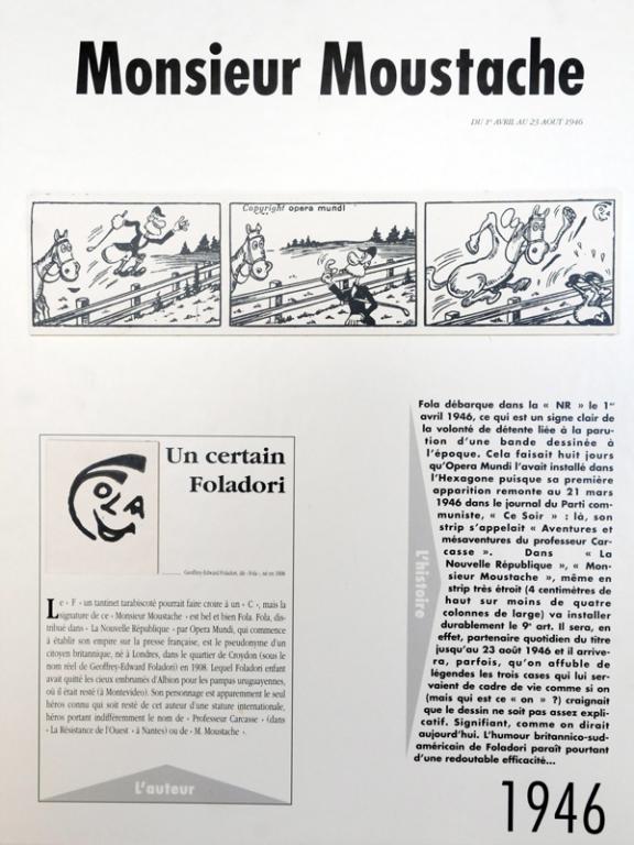 C’est parti et ce n’est pas un poisson d’avril. 1er avril 1946, la Nounou se lance dans la publication régulière d’un strip (en trois images celui-là) mais très étroit (4 centimètres de haut, ce qui n’est pas beaucoup mais s’explique encore par le besoin de place et le peu de papier disponible). Dix jours auparavant, un des journaux du parti communiste, Le Soir, dirigé par Aragon, avait lancé le mouvement : la presse quotidienne française retrouvait la BD. Le strip s’appelait Aventures et mésaventures du professeur Carcasse*. Il était signé Foladori. Or, ce « professeur Carcasse », on va le retrouver sous le nom de  Monsieur Moustache (grosses moustaches blanches en forme de balai-brosse en effet) toujours signé Foladori, dans les colonnes de la NR. Jusqu’au 23 août 1946, il va connaître une parution régulière parfois agrémentée de « légendes » sous les trois cases, comme si « on » craignait dans le Centre-ouest que l’humour – pourtant assez évident – de Foladori ne soit pas explicite. Trop british, peut-être