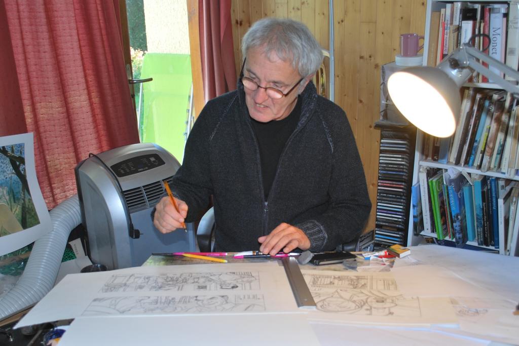 Jean-Pierre Gibrat travaille au prochain tome de Mattéo à la table de son atelier, entouré de livres et de guitares. (photo Anne-Sophie Perraudin)