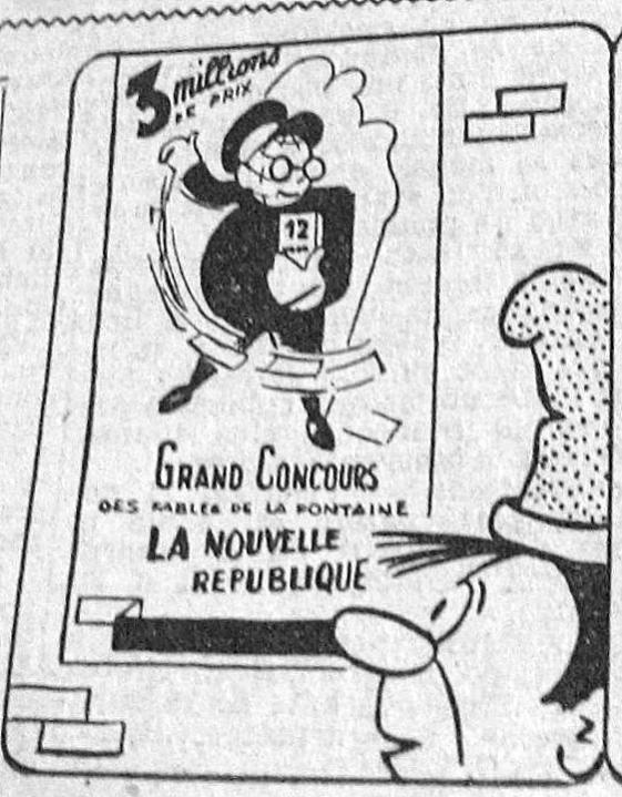 Baré, l’inconnu. Baré au style suffisamment facile à imiter pour que lors du lancement du grand concours des Fables de la Fontaine (trois millions de francs de prix, mazette !), le studio dessin du journal ne mette en scène un Monsieur Top qui « fait aussi le concours des fables ». Là, il n’y a aucune signature, évidemment. A moins, mais c’est une hypothèse fragile, que l’un des dessinateurs de la NR ne soit le mystérieux mister Baré !
