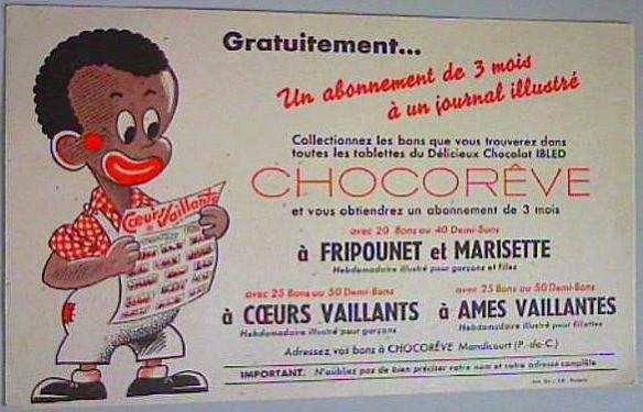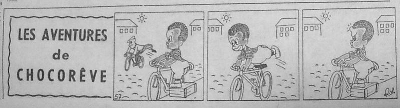 Les aventures de Chocorêve. C’est un peu l’histoire de la poule et de l’œuf. Ce strip est-il d’abord une publicité ; ou la publicité est-elle issue du strip ? Quoiqu’il en soit, dès 1949 commence dans le grand quotidien régional de Lille, la Voix du Nord, à apparaître un petit garçon noir facétieux aux bonnes joues rebondies nommé Chocorêve. Gags classiques en trois images signés d’un dessinateur nommé Rol. Un an plus tard, en juin 1950, la bande en question fait ses débuts dans la Nouvelle République, également dans la page Jeunes du jeudi. Pour une parution étalée probablement sur deux ou trois ans.