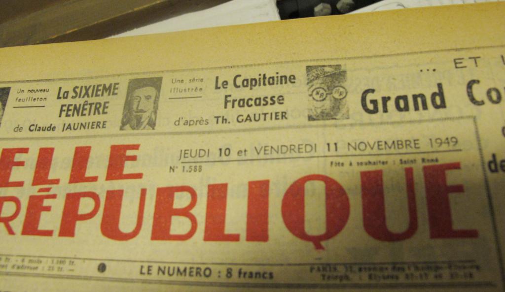 C’est un journal du week-end, au lendemain d’un jour férié. Le lendemain d’un 11 novembre de l’immédiat après-guerre. Comme d’habitude, une bonne quinzaine de titres s’enchevêtrent en première page de la Nouvelle République. Le lecteur de l’époque retiendra probablement qu’il peut ENFIN, répondre à la première question du Grand concours des fables de La Fontaine doté de trois millions de francs. Il ne manquera pas le graphisme étoilé annonçant un aéro-reportage (sic) au-dessus de l’Amérique.
