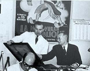 Le patron du service dessin de la NRCO, Emile Jaquemin, ici en veste noire à son fauteuil de commandement, a-t-il inventé le mariage entre ces deux mots « bande » et « dessinée », ou l’avait-il déjà vu (lu) sur un contrat d’Opera Mundi, par exemple ? Qui sait !