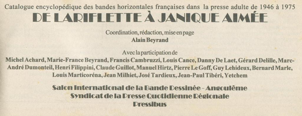 (*Patrick Gaumer/Claude Moliterni in « Dictionnaire mondial de la bande dessinée ». Ed. Larousse – 1998 – Page 50/ Alain Beyrand in « De Lariflette à Janique Aimé ». SIBD-SPQR-Pressibus – 1995 – Page 9 )