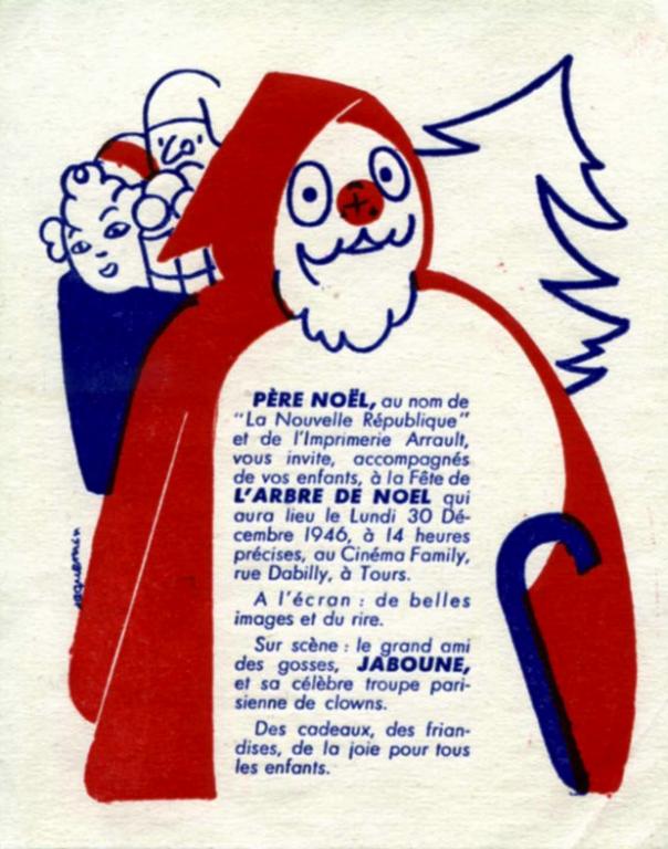 Lequel Jean Nohain est déjà venu en Touraine, invité par la Nouvelle République, pour animer (avec ses clowns, s’il vous plaît !) l’arbre de Noël du journal, comme en témoigne cette carte de… 1946.