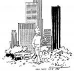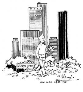 Bien sûr, il y a eu l’album Tintin en Amérique datant de 1932 ou encore ce dessin peu connu d’Hergé réalisé le 29 avril 1972 lors d’une convention de bande dessinée à New York et montrant le célèbre reporter effectuant une promenade dans Central Park accompagné par Milou.