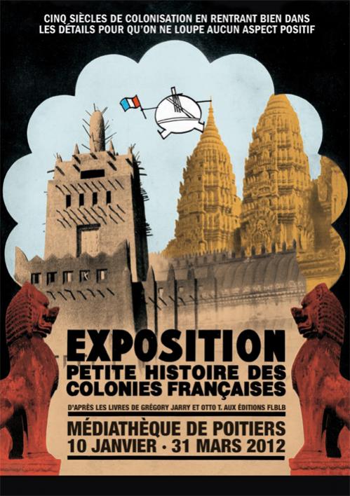 Depuis plusieurs années, deux Poitevins d’adoption, Thomas Dupuy, alias Otto T. et Grégory Jarry, fondateurs des éditions flblb travaillent cette question. Auteurs de Petite histoire des colonies françaises (*) ils en font aujourd’hui une exposition, visible à la médiathèque François-Mitterrand de Poitiers jusqu’au 31 mars.