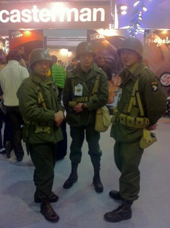 17h45. Devant le stand Casterman, trois soldats de la seconde guerre mondiale effectuent la promotion de la série Airbone de Jarbinet.