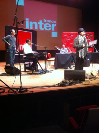 9h15. Chef d’orchestre des concerts de dessin, Areski Belkacem et le pianiste Dondieu Divin, effectuent les balances à l’Espace Franquin avec l’équipe de France Inter. Areski doit chanter en direct Bouche dorée à 12h05 dans l’émission Les Affranchis. Il faut moins d’un quart d’heure pour que tout soit parfaitement réglé.