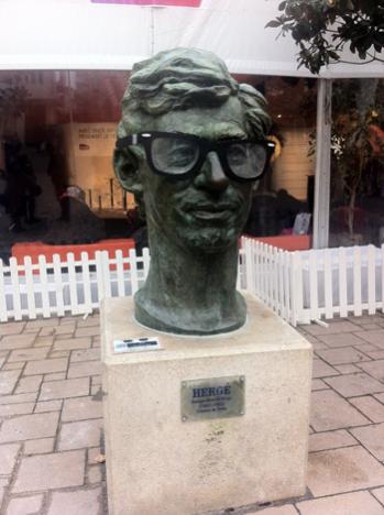16h15. Rue Hergé, le buste du père de Tintin réalisé par son ami Chang a été affublé de lunettes par un artiste de rue.