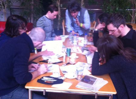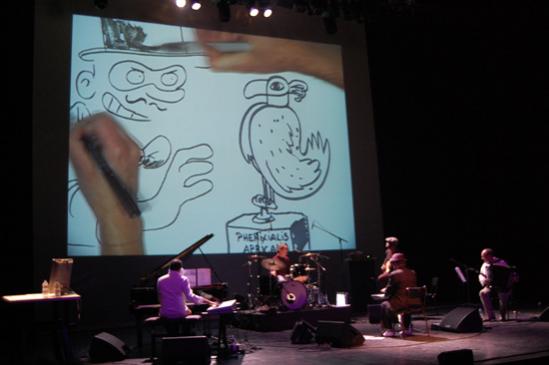 15h. Fin du concert de dessin. Pendant 1h, les auteurs de BD ont crayonné une histoire complète sous les yeux du public, tandis que les musiciens jouaient des morceaux pour la plupart issus du répertoire de Brigitte Fontaine et Areski Belkacem, adaptés à chaque case. Exceptionnellement grandiose. A voir absolument.