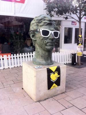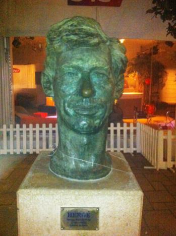 9h. Tiens, ce matin le buste de Hergé a troqué ses lunettes noires pour des lunettes blanches.