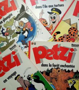 Présente dans 21 pays, transformée en dessin animé (dès 1972), en série télévisée, les aventures de Petzi vont être célèbrée en France grâce aux deux séries BD éditées par Casterman. La première de 1958 à 1984 (32 albums) ; la seconde de 1985 à nos jours (26 albums). Les Hansen (ou plutôt leurs successeurs) finiront par mettre (en 1981) des bulles dans la bouche de leurs petits animaux et par abandonner une étonnante technique didactique, où à côté de chaque texte sous l’image, un petit dessin indiquait à l’enfant-lecteur quel personnage s’exprimait.