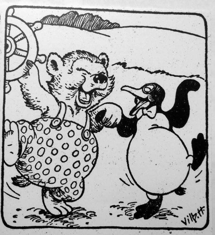 Restaient les copains du petit héros. Un pingouin qui ressemble très fort à l’Alfred d’Alain Saint-Ogan (qui servit de symbole aux premiers prix d’Angoulême, ce qui était quand même mieux que les Fauves !) : ce sera Pingo (fallait pas être… manchot pour le trouver !) ; un pélican qui sort tous les ustensiles possibles de son large bec, se nommera… Pelli (sans commentaires, cette fois) ; un phoque qui commande le bateau Mary qui va se balader dans toute la planète imaginaire : il est l’Amiral (il deviendra Barbe plus tard). Le trio composé de l’ourson, du pingouin et du pélican donne donc les aventures de Nounou, Pingo et Pelli. Version tourangelle oblige. Ces noms n’apparaîtront nulle part ailleurs.