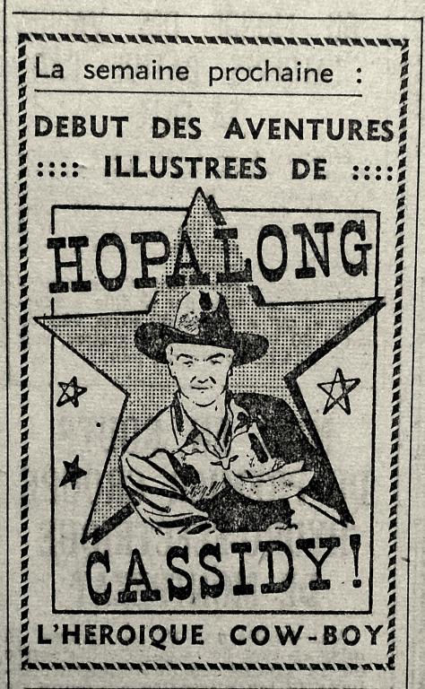 Dès le 14 octobre 1954, la NR annonce son prochain western, Hopalong Cassidy. Qui l’a choisi ? Curiosité : à la même époque, le magazine danois Konk Kylie va publier en même temps (de 1950 à 1955) les aventures de Matho-Tonga ET de Hopalong Cassidy. Coïncidence ? Autre remarque : c’est d’aventure illustrée dont il s’agit, pas de bande dessinée !!!