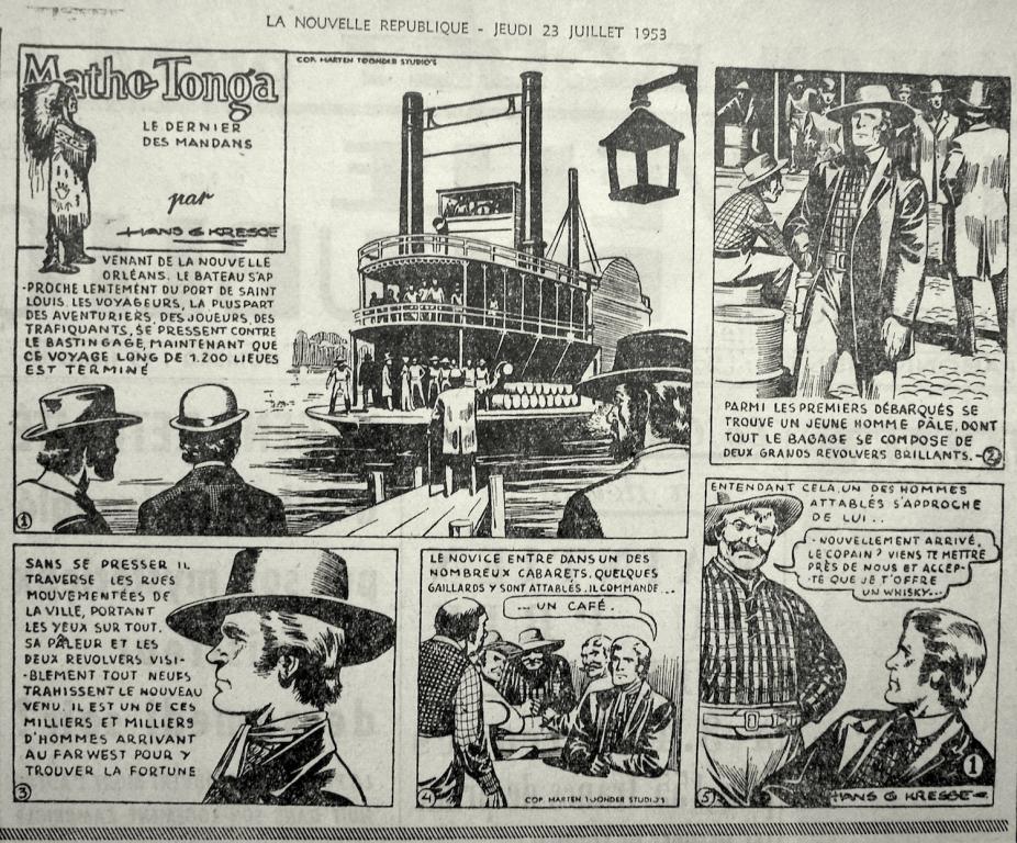 C’est en juillet 1950 qu’il va se promener de Nantes à Tours pour faire entrer Tom Pouce et M. Bommel dans les colonnes du Courrier de l’Ouest et de la NRCO. C’est en juillet 1953 qu’il va revenir avec dans ses bagages une histoire de cow-boys, Matho-Tonga. A cette époque, Jon de Swaan commence à être en rupture de ban avec Marten Toonder. Le copyright de la bande de Hans Kresse est toujours celui des studios d’Amsterdam mais bientôt la signature Swan Features Company le remplacera.