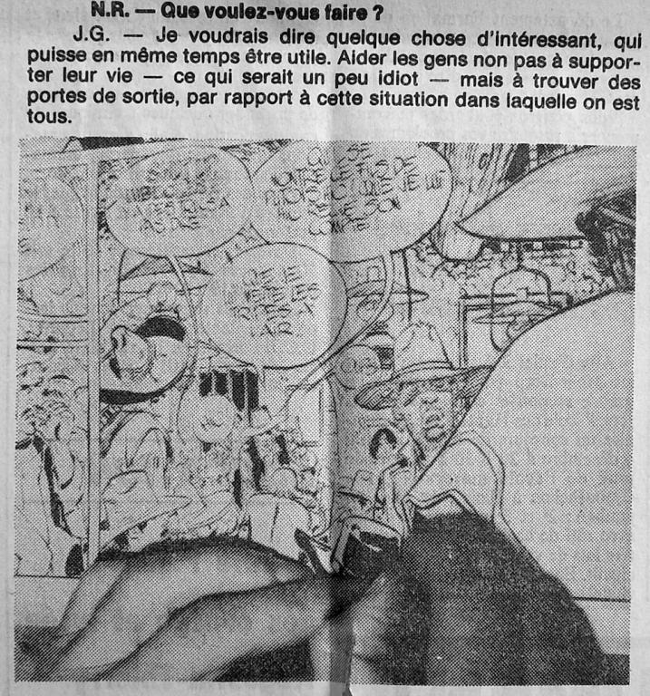 Extrait de l’interview recueillie en décembre 1982 par notre confrère Hervé Larroque. Jean Giraud y évoque déjà l’hypothèse (qui va se confirmer) d’un départ en Polynésie.