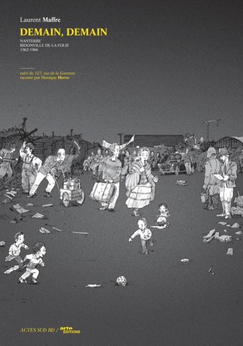 C’est le cas à Nanterre. Rue de la Garenne, celui dit de « La folie » s’étendait sur 21 hectares et accueillait environ 1.500 ouvriers et 300 familles. Il se tenait sur les terrains du futur établissement public pour l’aménagement de la défene ( EPAD). Pas d’électricité, pas d’eau courante, et une seule adresse administrative, le 127 rue de la Garenne. C’est ce pan d’histoire méconnu, voire oublié, que retrace Laurent Maffre dans Demain, Demain, un beau et dense roman graphique que publie ces jours-ci Actes Sud BD.