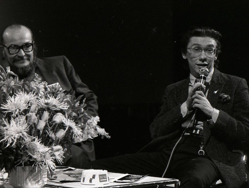 Pierre Pascal (à gauche) avec Jean-Pierre Dionnet à l'occasion d'un débat lors du festival 1984. (Photo Patrick Lavaud)