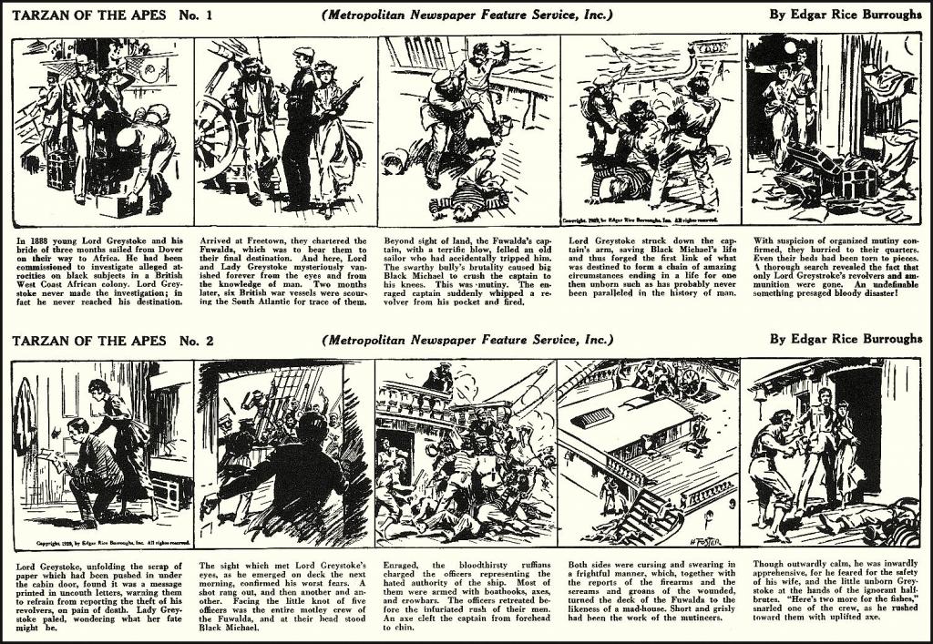Le héros en question est musclé, porte un pagne et crie dans les lianes : et le 7 janvier 1929, Tarzan of the Apes paraît (d’abord en strip) dans les journaux américains (après un curieux détour d’une année par la presse britannique). Le même jour, petits bédéphiles le saviez-vous ?, que le roi de la SF, Buck Rogers (« in the year 2419 ») ; trois jours avant un reporter en pantalon de golf dans le « Petit Vingtième » de Bruxelles ; et dix jours avant un marin aux gros biscottos amateur d’épinards. En deux semaines, Foster, Hergé, Segar, et Nowlan : étonnamment bédéphile, ce mois de janvier 1929, non ?