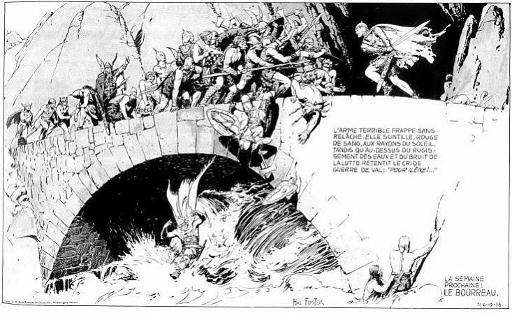 Publiée par planches entières (y compris dans la NR), avec le texte SOUS l’image mais DANS le cadre, la BD baigne dans des décors fabuleux, une précision graphique exceptionnelle où chaque détail – malgré parfois des sauts de quelques siècles – semble sorti d’un livre d’histoire médiévale. Les scènes de combat, les armes, les tenues, les châteaux, les masures, les villages, les drakkars, tout paraît d’un réalisme étonnant. Hal Foster passait, dit la légende, cinquante heures à sa table à dessin pour chaque page !