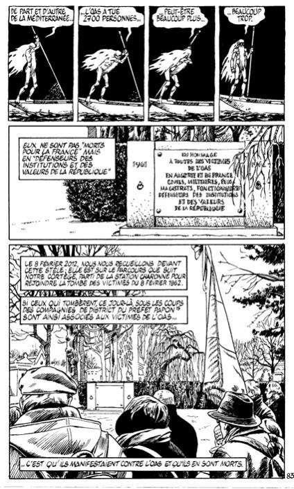 Construit sur des noirs profonds, des slogans d’époque dont les lettres jalonnent quasiment chaque planche, ce Charonne-Bou-Kadir propose un regard aigu sur cette période encore à vif de notre histoire contemporaine. Les lettres « OAS » y deviennent parfois « CHAOS », « CHARONNE »se transforme en « Carnages », « BARBARIES » s’assimile à « BARBOUZES ».