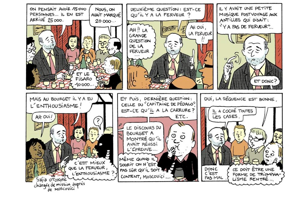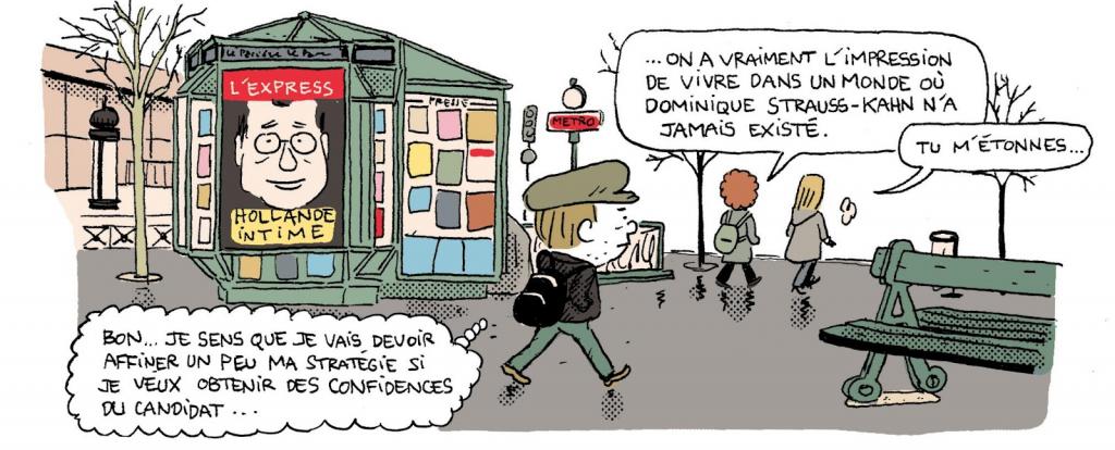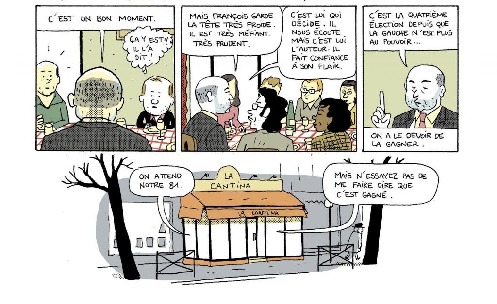 De son propre aveu, Mathieu Sapin n’est pas « un fondu » de politique. Il ne lit pas beaucoup la presse, ne regarde pas la télévision et ne fréquente pas les estrades politiques…Ce qui rend d’autant plus intéressante cette « chronique » politique. Avec des séquences plus ou moins longues, sur un simple trip ou à travers quelques pages, on suit les grandes étapes qui ont mené l’ancien premier secrétaire du PS à la victoire. Aparemment, Sapin a pu écrire et dessiner ce qu’il voulait, sans avoir de comptes à rendre à l’entourage du candidat.