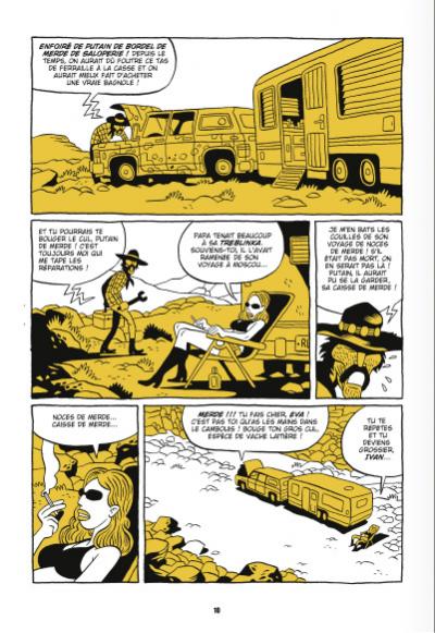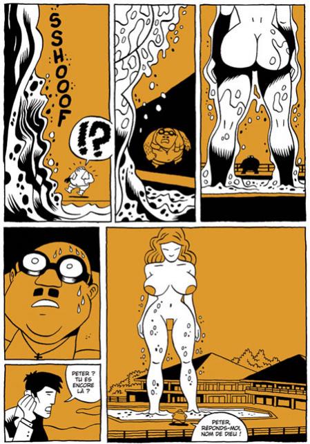 Difficile de résumer l’histoire de ce petit bijou de 150 pages. On se bornera à vous planter le décor. Tout commence dans le désert de l’Arizona. Là, une belle blonde à la poitrine généreuse bronze dans un transat alors que son frère, un fou furieux débitant dix insultes à la minute tente de réparer leur voiture en panne. Soudain, surgi de nulle part, un jeune playboy à la barbe de trois jours s’invite à boire un verre dans la caravane que traînent le frère et la soeur. Quelques instants plus tard, l’homme perdu va se transformer en monstre dégoulinant et déchiqueter la belle blonde…