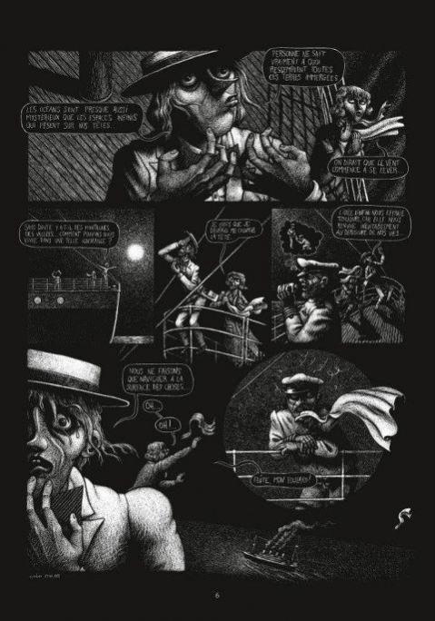 Cet album est de la belle ouvrage, sans doute autant par son graphisme original que par son histoire. Emre Orhun utilise ici la technique de la carte à gratter. A l’aide d’une pointe très fine, il gratte les planches recouvertes d’encre noire afin d’en extraire les traits de blancheur qui révèleront ensuite formes et volumes. Le résultat est impressionnant et donne à l’ensemble cette touche de fantastique et de mystère qui colle parfaitement à l’histoire…
