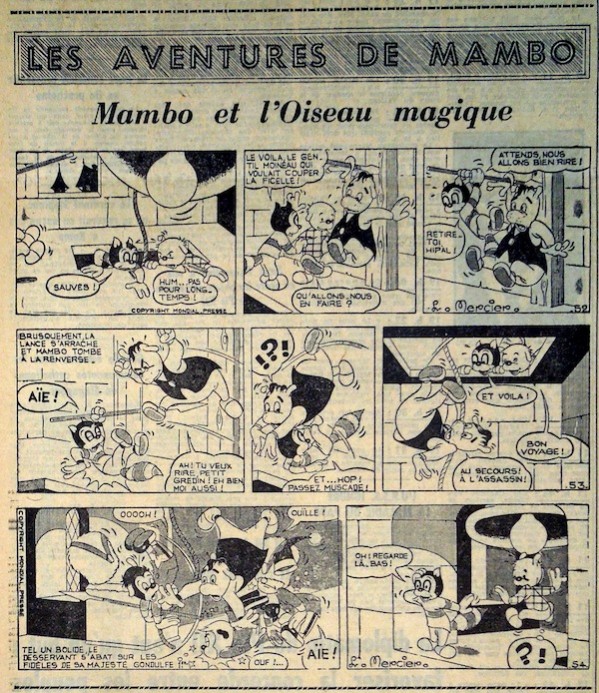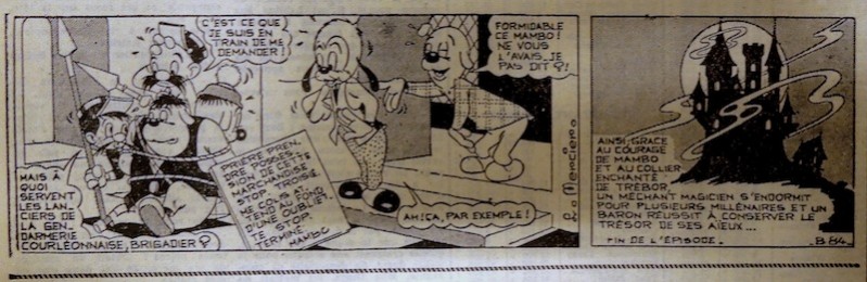 Après avoir fait ses débuts (en 1957) dans les colonnes du Parisien Libéré, Mambo, le raton-laveur imaginé par Léon Mercier va donc vivre trois épisodes de ses aventures au royaume de Courléon dans les pages du jeudi de la Nouvelle République, qui publie, en même temps « Le Bossu » de Paul Féval (en feuilleton dessiné, bien sûr), du Bommel en veux-tu, en voilà, « L’aventure mexicaine » signée Marcello (oncle Erwann en reparlera), bref le grand jeu de cette période. Mambo va aussi s’illustrer dans les colonnes d’autres régionaux par la grâce de l’agence Mondial Presse de Cino del Duca qui vient de « débaucher » Léon Mercier qui jusqu’alors travaillait pour Opera Mundi : le Télégramme de Brest, La Montagne (Clermont-Ferrand), Sud Ouestdimanche (Bordeaux) et des titres belges et suisses publieront ces historiettes. « Jusqu’à quatorze journaux à la fois » assure aujourd’hui Léon Mercier, qui en est manifestement très fier.