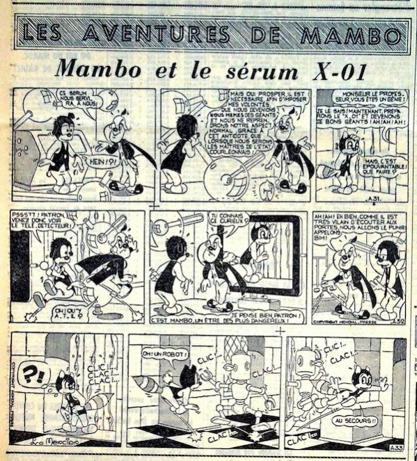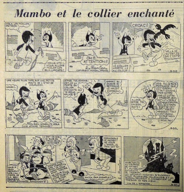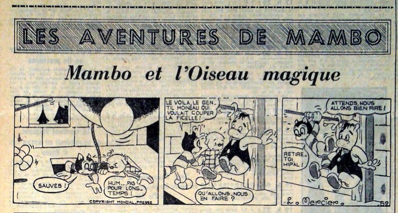 Léon Mercier, totalement inconnu aujourd’hui, un gros brin de célébrité bédéphile à l’époque. D’autant que juste avant Mambo, il a été le repreneur (scénario et dessins) d’une star du neuvième art, encore un animal, Félix le chat. En déshérance depuis des années après avoir été dessiné par Otto Messmer en 1923 aux Etats-Unis (mais imaginé par les studios de son patron, l’Australien Pat Sullivan dès 1919), le petit chat noir avait été récupéré pour la France par Opera Mundi qui relayait le King Features syndicate (KFS).