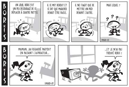 Boris est un petit garçon qui ne sait pas encore marcher. Né de l’imagination de Rémy Simard, ce qu’aime par dessus tout ce charmant bambin, c’est débouler dans l’escalier ou encore s’imaginer lorsqu’il sera plus grand. Il se questionne sur sa vie et la vie en général. L’auteur montréalais compile dans cette Intégrale, les quatre tomes initialement publiés par La Pastèque depuis cinq ans. Il y a quelques années, les extravagances de ce petit bonhomme furent pré-publiés dans La Presse ou le Quotidien au Québec.