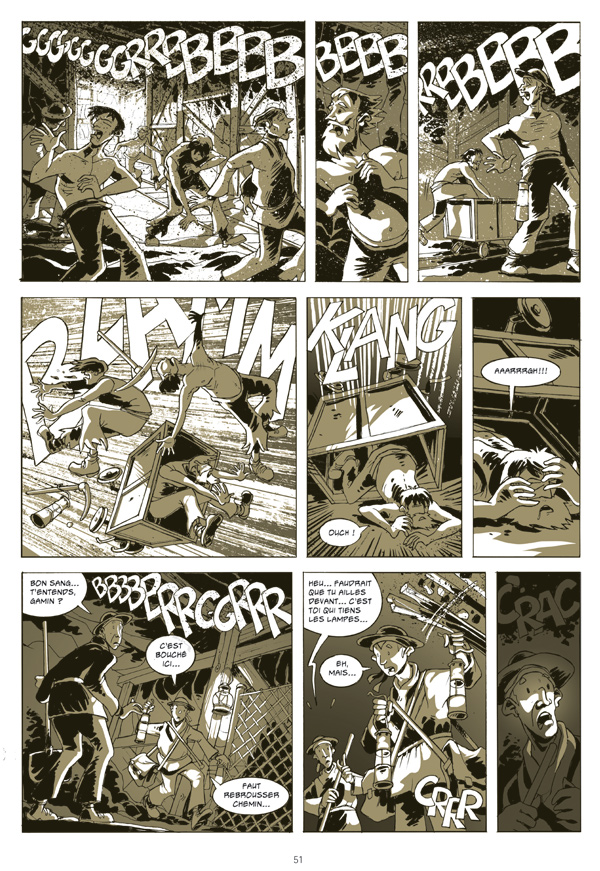 Son trait semi-réaliste en noir et blanc, réhaussé de gris, permet une belle précision sur les objets du quotidien et de la mine, ainsi que de magnifiques planches en une case notamment la scène de l’explosion. Un album admirable et remarquable.