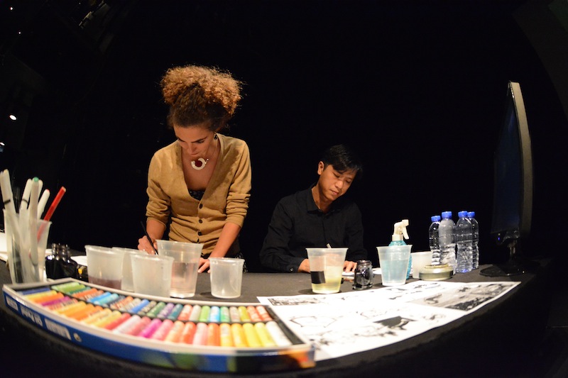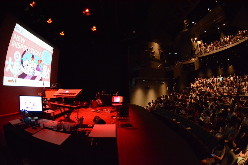 Deuxième étape quelques jours plus tard à Hong Kong, où deux représentations ont été données respectivement les 7 et 8 juin au Hong Kong Arts Centre. Si la formation musicale restait inchangée, le casting graphique avait évolué puisque Charles Berberian était rejoint d’une part par la dessinatrice Mathilde Domecq et d’autre part par deux dessinateurs hongkongais déjà présents sur la scène du théâtre d’Angoulême pour les Concerts de dessins du 40e Festival en janvier dernier, Little Thunder (également traduite en français chez Kana) et Siuhak.