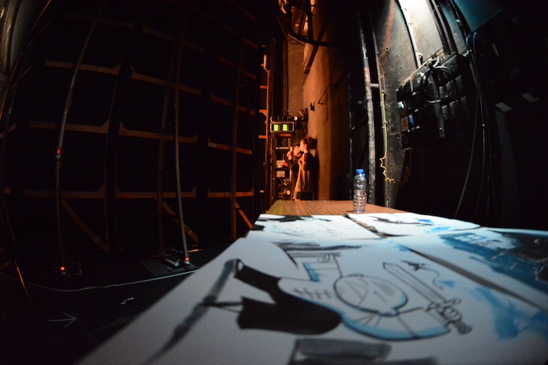 Depuis les coulisses. Les dessins réalisés durant le spectacle sèchent tandis qu’en arrière plan, Mathilde Domecq s’apprête à entrer sur scène. (Photo Nicolas Albert)
