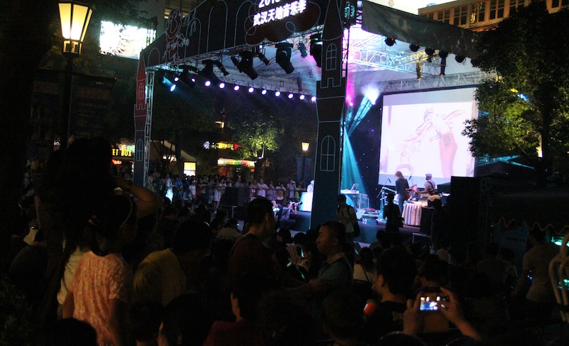 Le parcours des Concerts de dessins a commencé le 2 juin à Wuhan, grande ville du centre de la Chine sur le cours du fleuve Yangzi. Animé musicalement par la formation d’Areski Belkacem — soit autour d’Areski Belkacem (composition), Yan Péchin (guitares), Boby Jocky (basse), Dondieu Divin (claviers) et Patrick Baudin (batterie) —, le concert de Wuhan, a réuni sur scène le Français Charles Berberian et le Chinois Li Kunwu, déjà connu des lecteurs francophones par ses ouvrages Une vie chinoise et Les pieds bandés parus chez Kana.