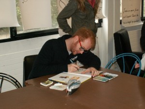 Enfin, la dernière salle Rencontre Jeunesse accueillait Baba, Marie Deschamps, et Lepithec, le dessinateur originaire de Poitiers. Avec son complice Bacaria, lui aussi natif de Poitiers, ils avaient participé, plus jeunes, aux ateliers Bidibulle de Saint-Benoit, avaient créé une fanzine pour ensuite s’installer dans le monde de la bande dessinée avec José Lapin (Emmanuel Proust) et la série jeunesse Sally et Peter, dont le nouvel album sortira le mois prochain (Sarbacane).