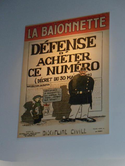 C’est à partir de 1915 qu’il travaille pour La Baïonette. Dans l’exposition, le visiteur pourra admirer de grandes reproductions des unes du journal, en format affiche : Les Britanniques ou Nos amis les Russes. Il pourra déambuler devant les dessins de Gus Bofo regroupés par thématiques : Le rêve du général, Le soldat débrouillard, La grande farce, Matin de guerre, Le jeu de la tranchée, En attendant la guerre prochaine, Le glorieux blessé (Bofa sera réformé en février 1916 pour impotence complète de son genou droit, il recevra une pension d’invalidité pour ce fait de guerre). Avec les illustrations, de nombreux textes tirées d’entretiens de l’auteur permettent de mettre en perspective les travaux.
