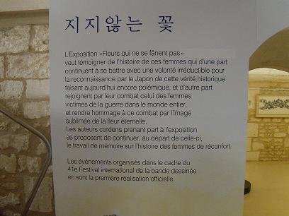 La 41e édition du Festival international de la bande dessinée d’Angoulême accueille « Fleurs qui ne se fanent pas », une exposition collective consacrée au douloureux sujet des « femmes de réconfort » et initiée conjointement par le gouvernement coréen, une association privée (l’Association coréenne pour le manhwa) et une institution publique (le Komacon, Korea Manhwa Contents Agency). Par le biais de la bande dessinée, les initiateurs de cette exposition souhaitent communiquer à un public international le point de vue de la Corée sur ce sujet, en le sensibilisant aux dommages irréparables subis par ces femmes.