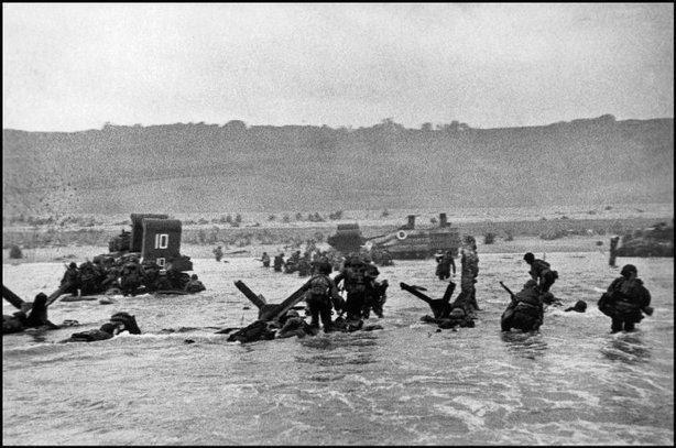 6 juin. C’est l’effervescence. Les soldats jouent, d’autres rédigent leur testament pendant que les officiers terminent de planifier les opérations. Capa embarque sur l’USS Henrico et commence à photographier l’intérieur de la barge puis lorsque la paroi se baisse, c’est le début du Jour le plus long. Tête baissée, il se réfugie derrière un hérisson d’acier installé par les allemands puis derrière un tank à moitié brûlé.