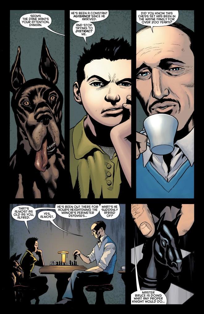 Le nouveau duo est alors appelé en urgence, à l’université de Gotham : Des voleurs viennent dérober l’uranium du réacteur. Après une belle bagarre, les malfrats sont en fuite sans leur fameux butin. Mais Batman est bouleversé par Damian, il se pose des questions et leurs relations sont tendues. Se confiant à Alfred, son majordome, il émet des doutes envers son fils. Il veut l’aider et le faire quitter définitivement le côté obscur de son ancienne vie. Pour cela, excédé par ses nombreuses demandes, il ne le fait pas sortir trois nuits de suite pour patrouiller. Le troisième soir désobéissant à son père, Damian saute sur sa moto afin d’aller en ville…