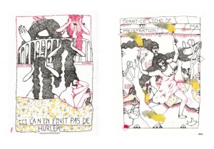 Voilà un album très singulier, dont la narration pourra désarçonner le lecteur. D’ailleurs Aurélie William Levaux introduit son ouvrage par une préface afin de l’avertir, conclut en expliquant qu’il n’y a aucune cohérence et qu’il n’y a pas de récit. Elle construit son album en mini-chapitres qui n’ont souvent pas de point commun entre eux. Les personnages féminins lancent à tout va des idées sans aucun jugement de valeur et sans réel but. Les personnages masculins sont souvent sous-entendus, parlant par voix-off. Le point fort étant la partie graphique où l’auteure utilise une technique originale, dessinant à l’encre sur des tissus.