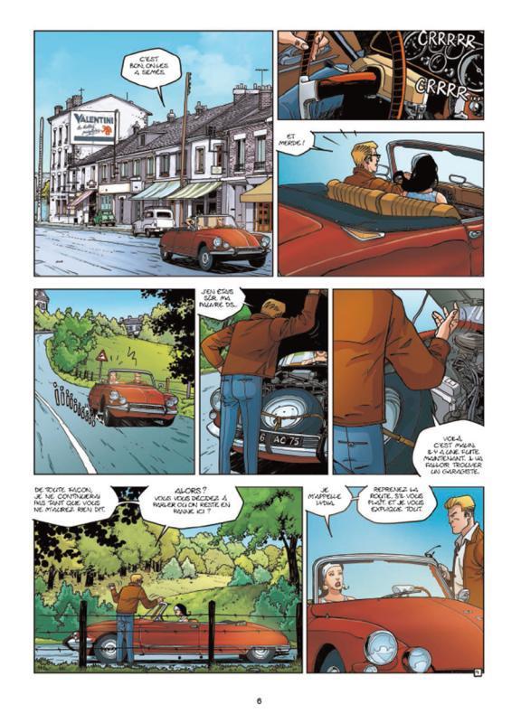Le récit de Laurent Moënard est extrêmement classique dans son approche. Efficace, il mise sur une course-poursuite à travers la France, sur la nostalgie de la France des années 60, sur une intrigue un peu mince mais surtout sur la DS (pannes, accidents, impacts de balle…). Le scénario se pare parfois d’un brin d’humour grâce au personnage d’Hubert mais aussi par la relation qu’il entretient avec Lydia, fugitive et co-pilote de fortune. Le trait réaliste de Phil Castaza est efficace sans rien non plus révolutionner. Néanmoins les cases faisant intervenir les voitures et les décors de villes sont bien maîtrisées et réussies. A noter qu’un cahier spécial de 8 pages sur la DS est adossé à l’album.