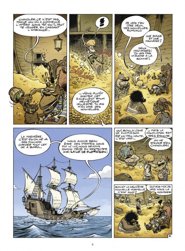 Grâce à l’or amassé depuis quelques temps, le Kouklamou est en fête : les hommes de l’équipage va pouvoir enfin vivre tranquillement jusqu’à 100 vies tant il coule à flot. Dans les cales du navire, ils chantent et s’amusent lorsqu’ils sont interrompus par Chandler qui leur annonce une mauvaise nouvelle : le bateau coule, sous le poids des pièces, il vient de passer sous la ligne de flottaison. Si cela n’a pas l’air d’affoler Romuald ; le jeune homme livrant les mauvaises nouvelles récidive : la bibliothèque du Capitaine prend l’eau et tous ses ouvrages sont mouillés.